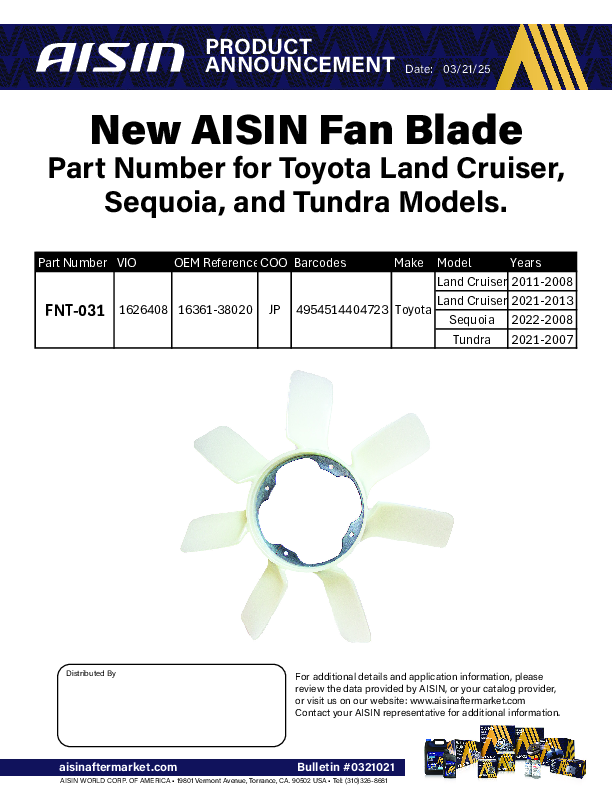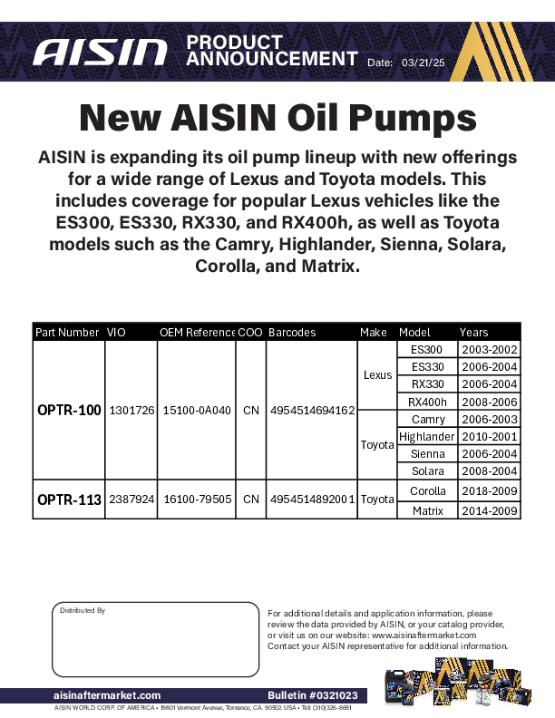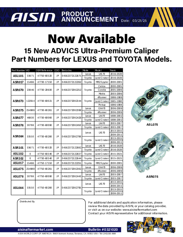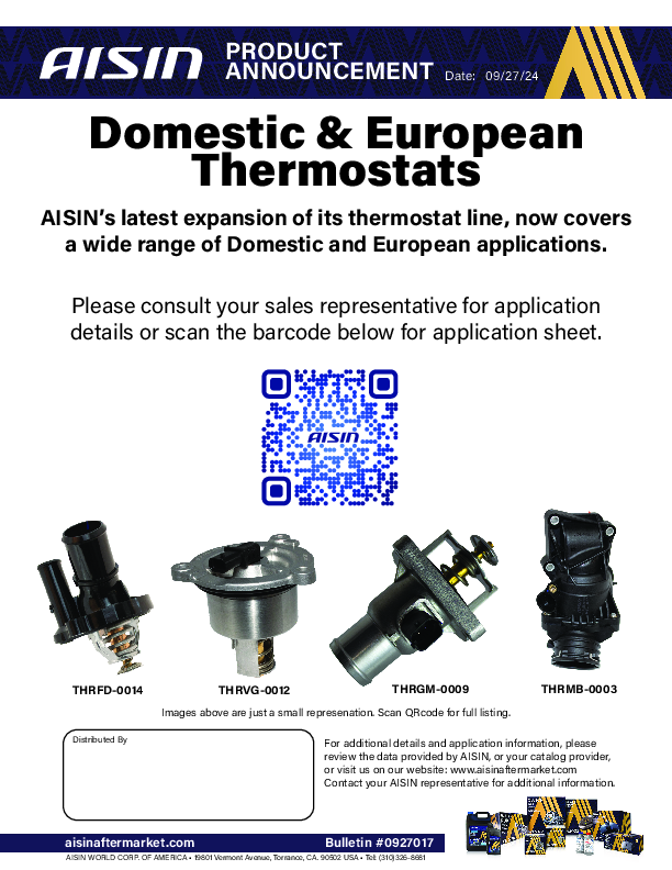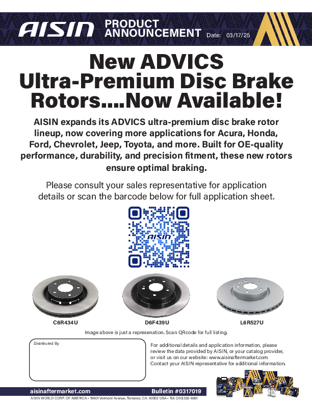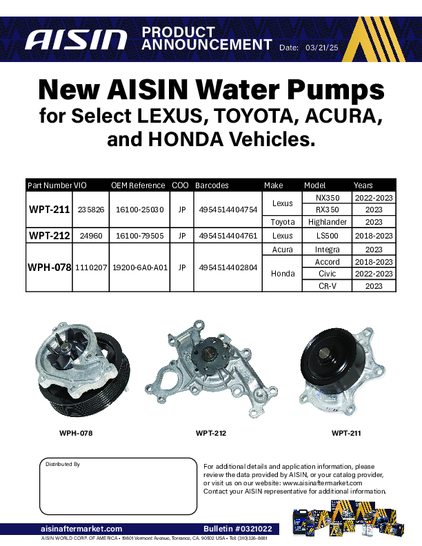This is where you will find the most recent bulletins posted by AISIN. The bulletins cover a wide array of information from corporate news and latest developments to new and updated products.